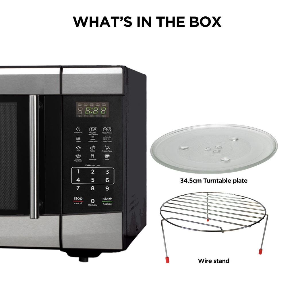 This microwave boasts a powerful 1100W and a generous capacity of 42L, making it ideal for heating, cooking, and defrosting various dishes in record time. Its grey-painted cavity, LED display, and grill function ranging from 1200-1400W make it a versatile kitchen appliance. With 11 power levels and 9 auto menu options/presets, this microwave offers precise control and convenience. It has a handle to easily open the microwave, timer adjustment, delayed start function, and a 34.5 cm diameter turntable plate further enhancing its usability. Additionally, its defrost function, based on weight and time, adds another layer of practicality to this appliance.
